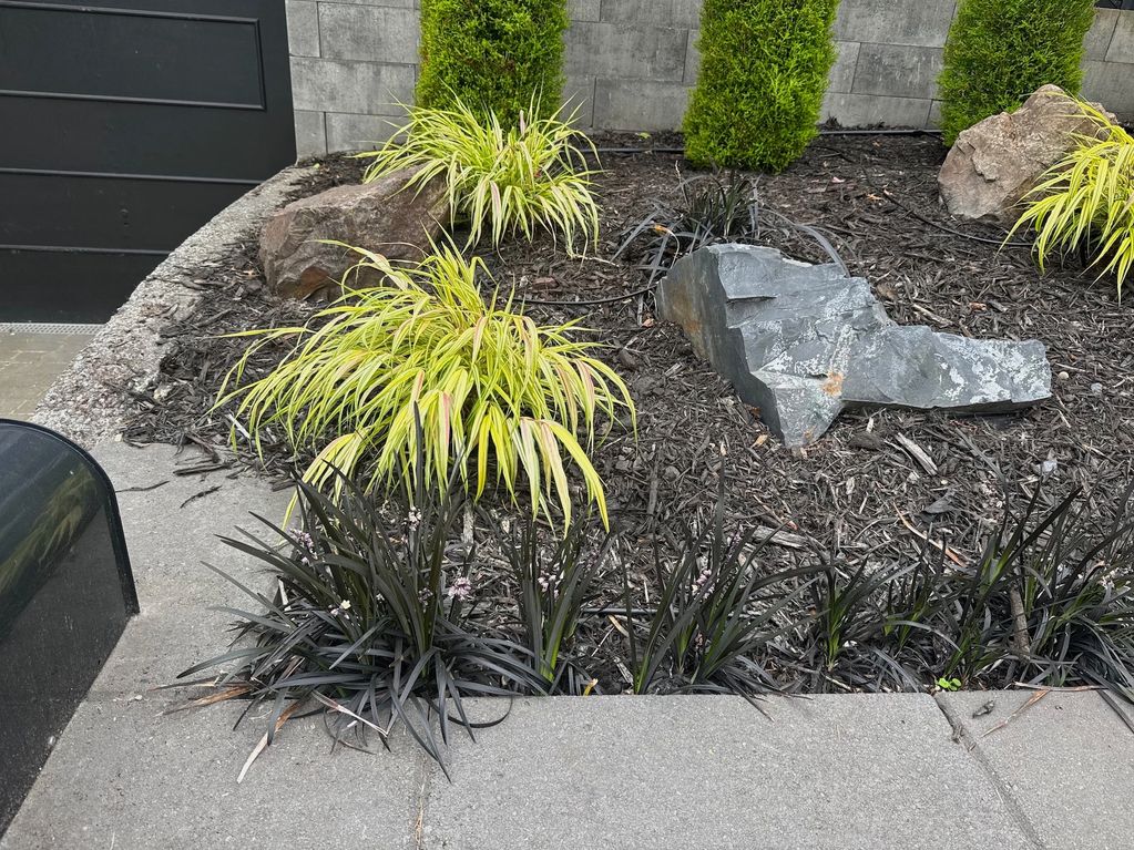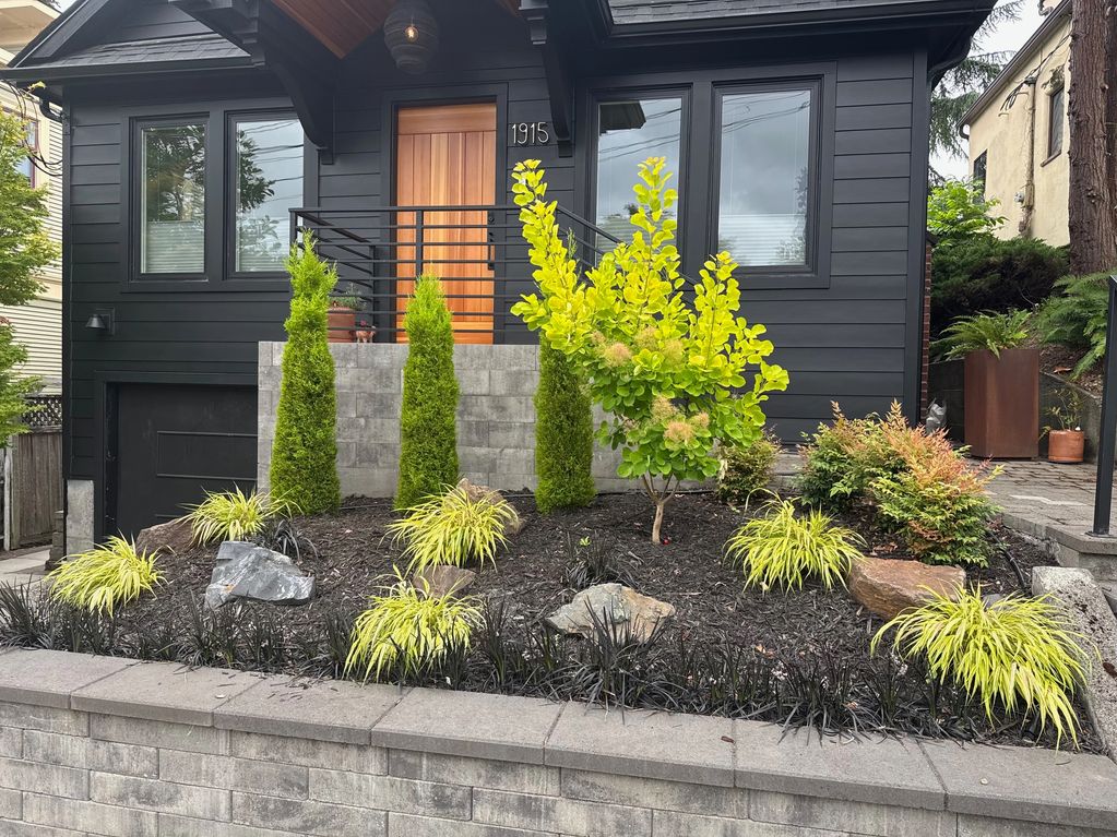 A stunning black house became a backdrop to a palette of neon green color plants. A green smokebush anchors the space and bright pops of Hakone grass and oranges of Heavenly Bamboo add texture and movement. A row of dancing Mondo grass make walking by this house a visual experience. We worked closely with the owners to achieve this project 10